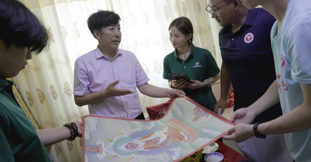 实践团探访了噶当派唐卡非遗传承。传承人以黄金和天然矿物为原料,遵循布达拉宫传统工艺,一笔一画皆是修行,简单作品需十数日,复杂者耗时数年。他通过微信线上线下双语教学,覆盖甘孜18县300余名学生,免费帮扶贫困、残疾人群。更创新融合三星堆文化,设计康定路灯等文创,既守天然色、派系风格之正,又以创新续文脉,让唐卡成为民族团结与公益传承的纽带。